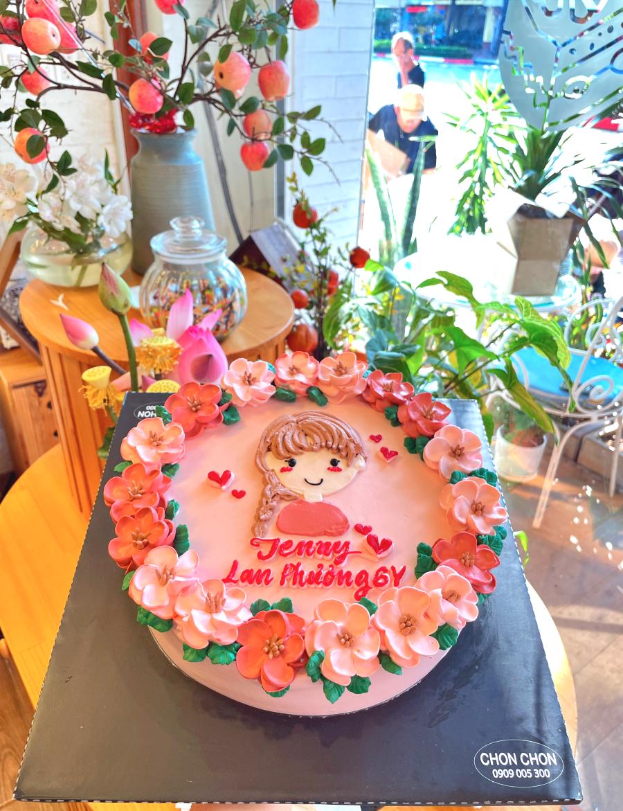 Bánh sinh nhật bắt hoa kem với hoa đào